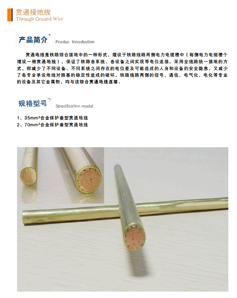 貫通地線是鐵路綜合接地中的一種形式,埋設(shè)于鐵路線路兩側(cè)電力電纜槽中(每側(cè)電力電纜槽個(gè)埋設(shè)一根貫通地線),保證了鐵路各系統(tǒng)、各設(shè)備之間實(shí)現(xiàn)等電位連接,采用全線路統(tǒng)一接地的方式,即減少了不同設(shè)備、不同系統(tǒng)之間存在的電位差及可能造成的人身和設(shè)備的安全隱患,又減少了各專(zhuān)業(yè)單設(shè)地線對(duì)路基的穩(wěn)定性造成的破壞,鐵路線路兩側(cè)的信號(hào)、通信、電氣化、電化等專(zhuān)業(yè)的設(shè)備及其它金屬物,均與該綜合貫通地線連接。