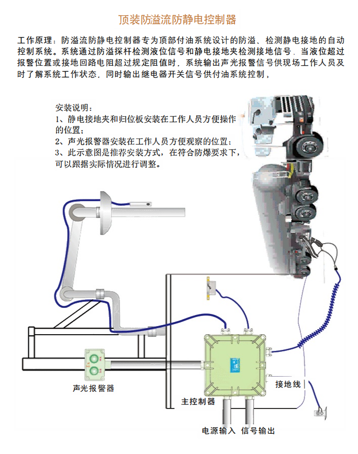 工作原理:防溢流防靜電控制器專為頂部付油系統(tǒng)設(shè)計的防溢、檢測靜電接地的自動控制系統(tǒng)。系統(tǒng)通過防溢探桿檢測液位信號和靜電接地夾檢測接地信號,當液位超過報警位置或接地回路電阻超過規(guī)定阻值時,系統(tǒng)輸出聲光報警信號供現(xiàn)場工作人員及時了解系統(tǒng)工作狀態(tài),同時輸出繼電器開關(guān)信號供付油系統(tǒng)控制,